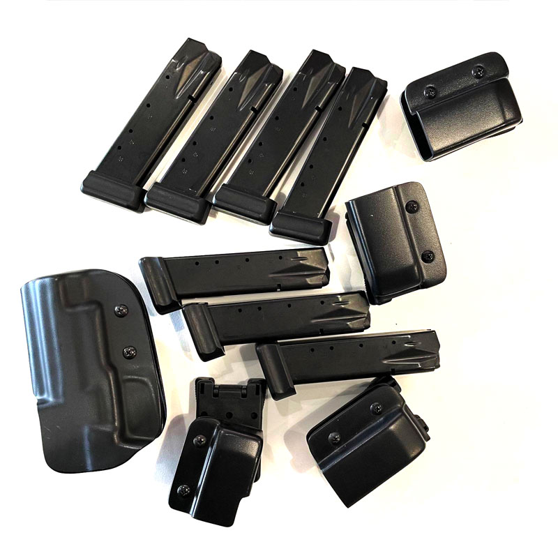 Totalt 7st 20-skotts magasin, 4st maghållare och BladeTech kydex hölster med techlock. Gått ca 2000 patroner. Mycket fint skick.