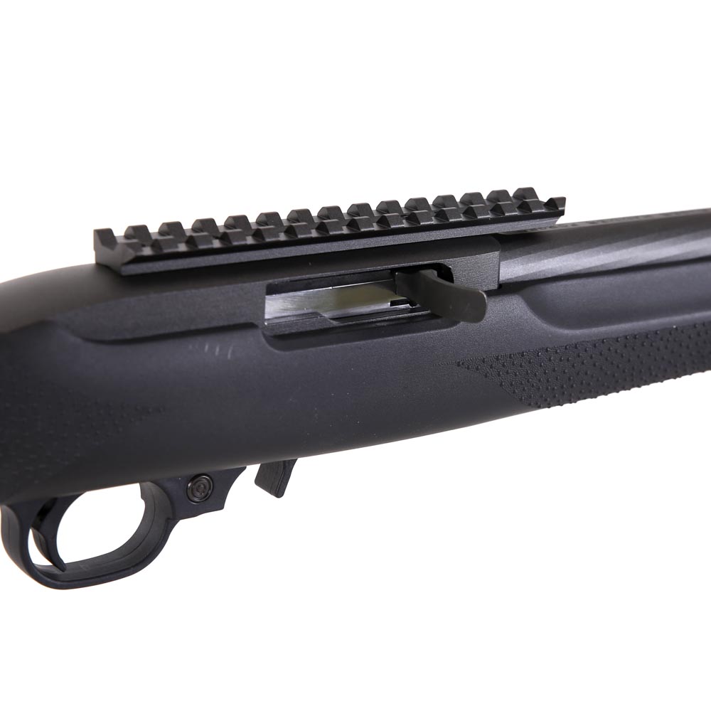 Ruger 10/22 Target i absolut toppskick. Hoguestock och gängad M18x1 med mynningsbroms. Pipa, låda och broms i Cerakote Tungsten, förlängt slutstyckshandtag, Kidd Picatinnyskena, Kidd Threaded Receiver Pins samt Tuffer Buffer.